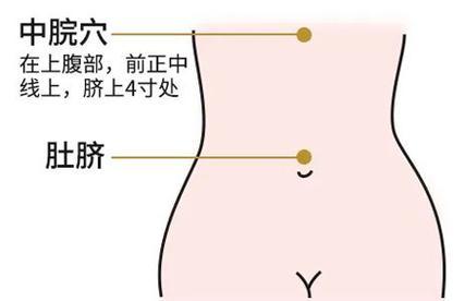 中脘穴:位于上腹部,肚脐上方4寸处。用指腹或手掌根部按揉此穴2~3分钟,能消食导滞、和胃健脾。